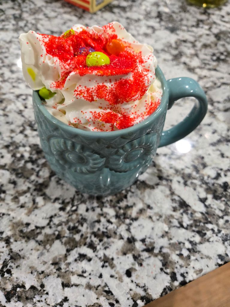 Coffee… You either love it or you just like to smell it. Or I guess you can hate both the taste and the smell. Some people will only drink it black. And some like me and the rest of my family.Well, not all of my family but most of my immediate family will only drink it with french vanilla or sugar cookie creamer. Or if you’re like me and my two year old tonight we drank it with extra creamy whipped topping and m&ms and red sprinkles. And thanks to my two year old, it’s a little heavy on the red sprinkles. Of course, I generally, water it down considerably for him due to the caffeine. Now that we are getting settled in our new house. I feel a sense of relief. Like, I’m not completely rushed to get everything finished and ready. I don’t feel like I’m in between three different houses. I feel like I can start those craft projects and sewing projects that I have been wanting and have put on hold for the last few months. I feel like I can spend more quality time with my kiddos. Instead of just feeding them and putting them to bed at night. Can I feel like I have more time to post. So here’s to coffee, quality time spent, and relaxation.