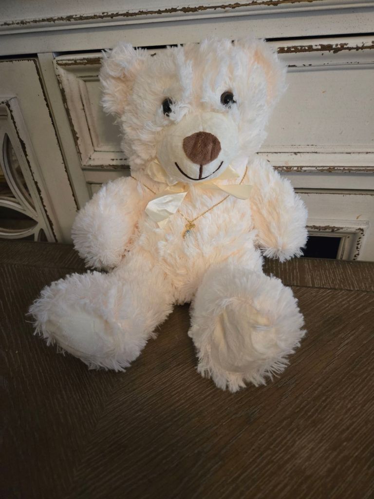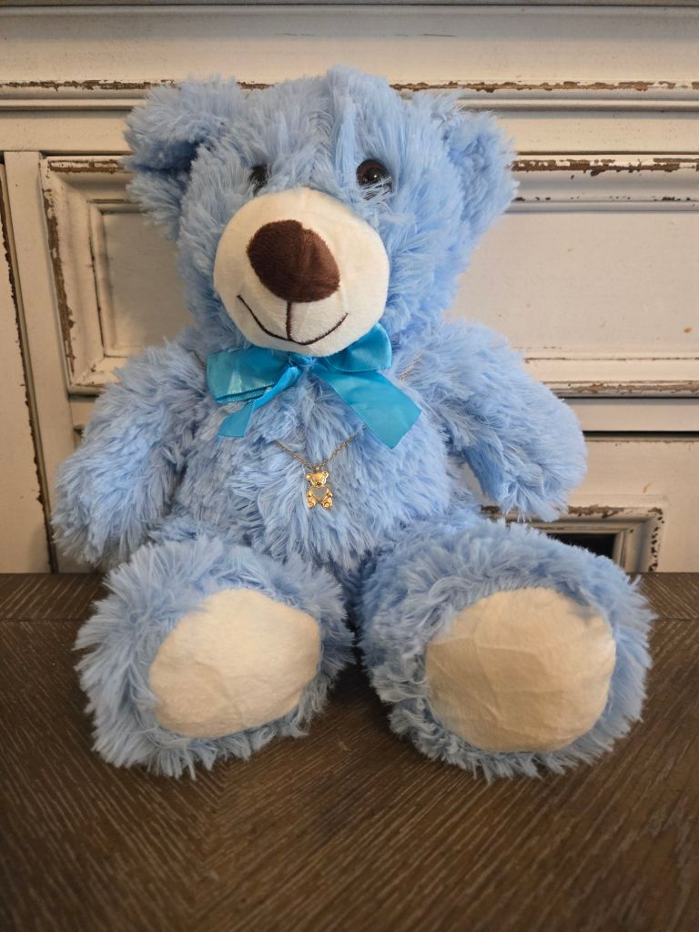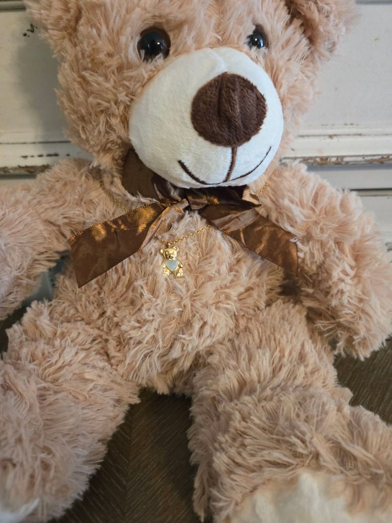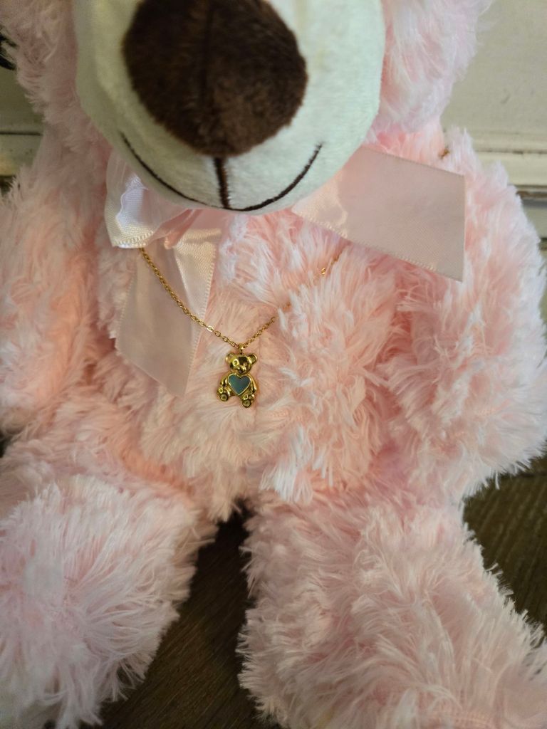 The items that I sell on etsy aren’t just items that I’m hoping I can make a few bucks with. These are things that mean something to me and are special to me. And I hope that they will mean something and be special to somebody else. So I may trll you about a few of them with time. When my husband’s aunt gave us some money to buy our youngest child a gift. I wanted to get something for her. Something that she would be able to play with as an infant and still have a part of it that she would be able to keep as a keepsake. The only thing I could think of was a teddy bear with a necklace. So I sat out online to try to find exactly what I was looking for. And of course, I couldn’t find anything like it. Which kind of blew my mind because you can find everything on the internet. So I decided to find different color teddy bears, something that little kids would enjoy and some pretty necklaces. They are soft, cuddly bears and whats better is now they have a necklace that hangs around their neck. And what’s even better than that is that it’s affordable. I have put my little girls necklace up out of reach until she is old enough to take care of it. But she is able to play with her purple teddy bear now. I held it up to her the other day and slowly a smile started to light up her face. And that one little dimple on her cheek started to show. I am so glad that I was able to give her this gift from her great aunt and great uncle. Even though that great uncle is gone. I feel like it was a gift from him too. And whenever she plays with that bear I can remind her of the special people that gifted it to her. And when she gets older, I can give her the beautiful necklace that goes with it. And I can already see the special place she’ll have for it on her dresser. The necklace hanging around the neck of the bear for all to view.